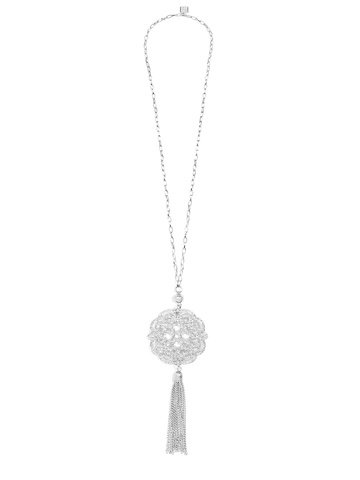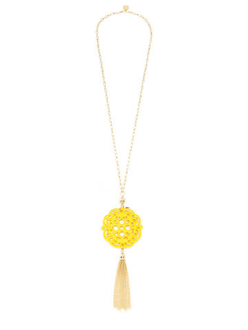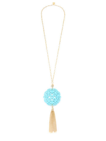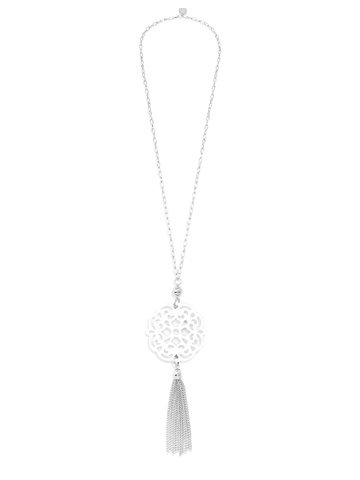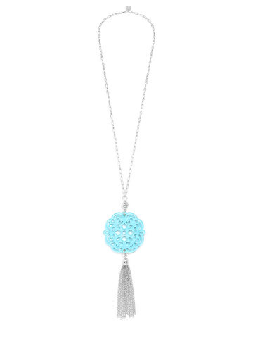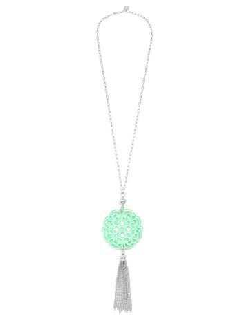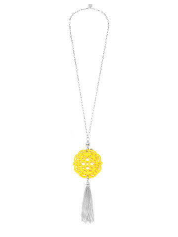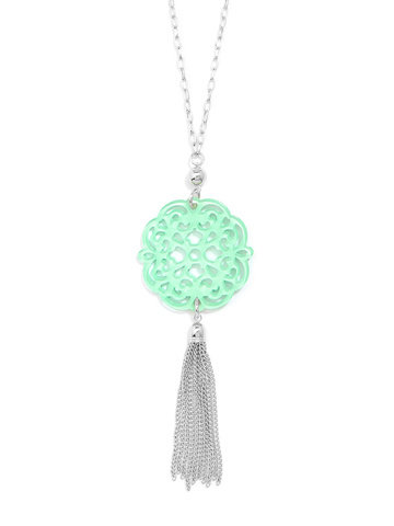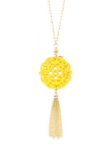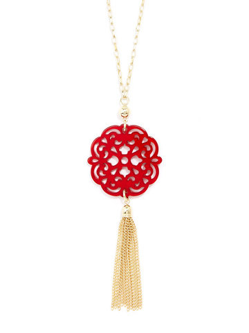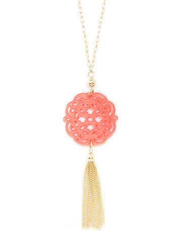 Long, shiny metal necklace with resin pendant in Allure cut-out design and metal tassel