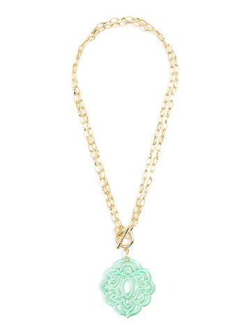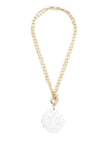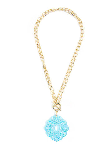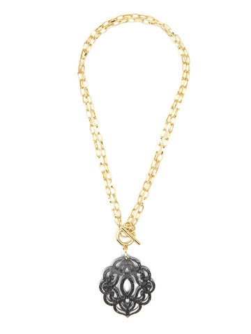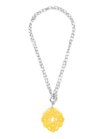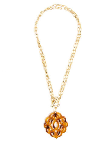 Long, shiny metal chain necklace with baroque-style resin pendant.