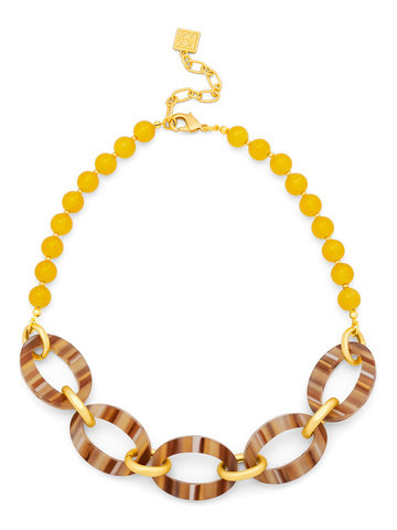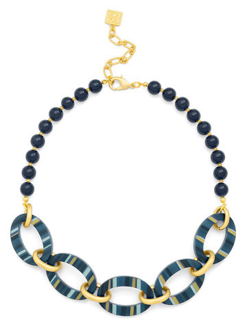 Collar necklace made from glassbeads, featuring striped resin ellipse shapes with metal spacers.