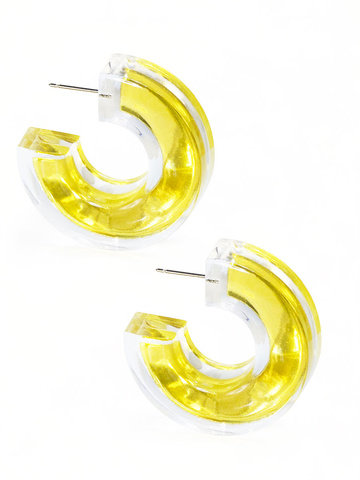 Open hoop earring made from premium grade lucite and embellished with gold and silver foil inside. The silver style is holographic.