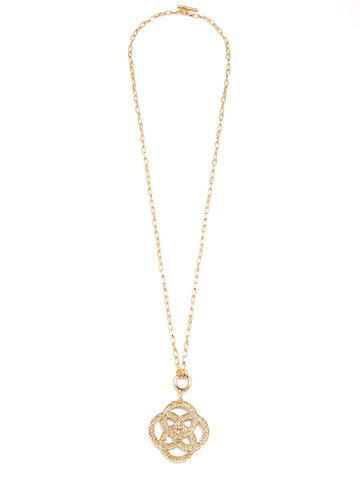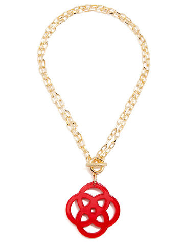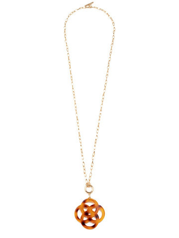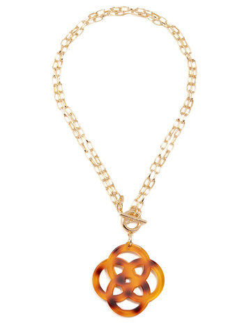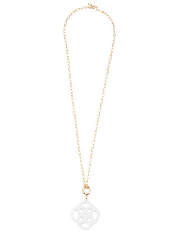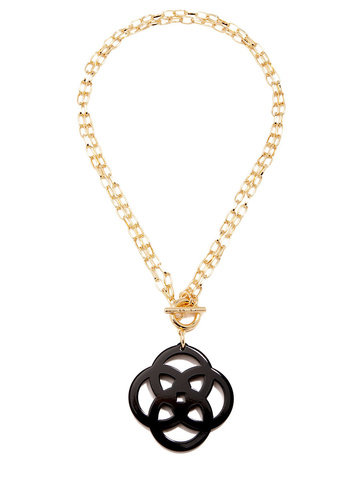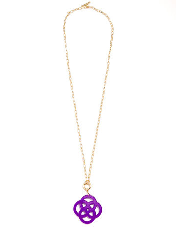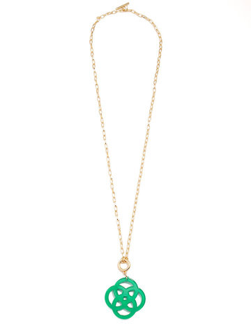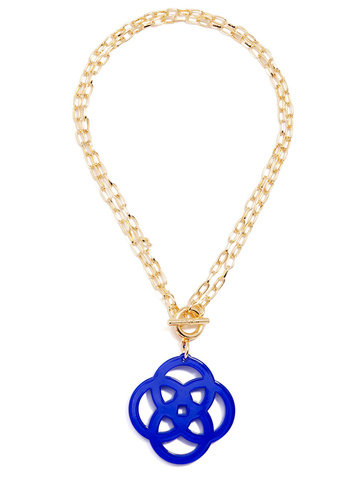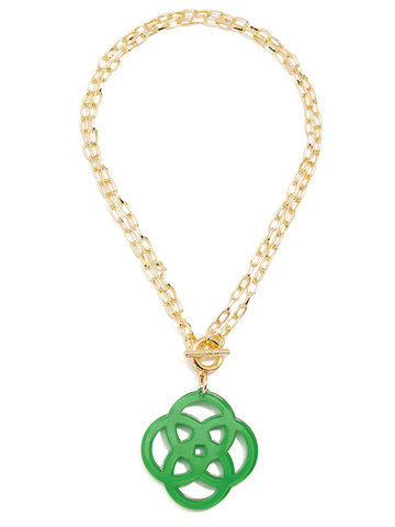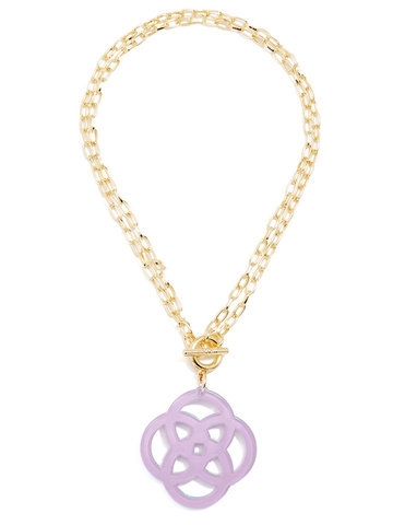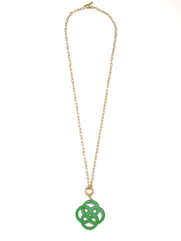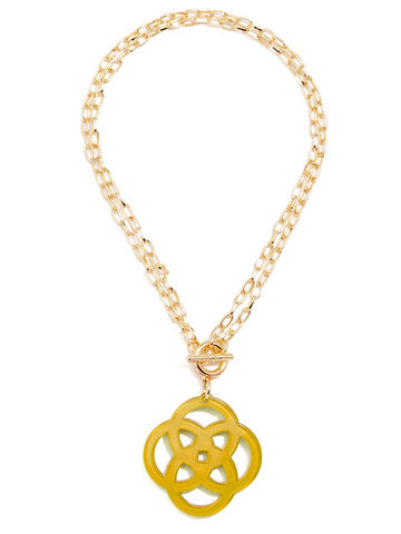 Brass-based cable link necklace embellished with a modified geometric clover pendant. This style is finished with a toggle closure and can be worn long or short.
