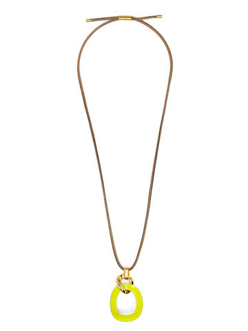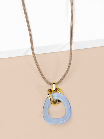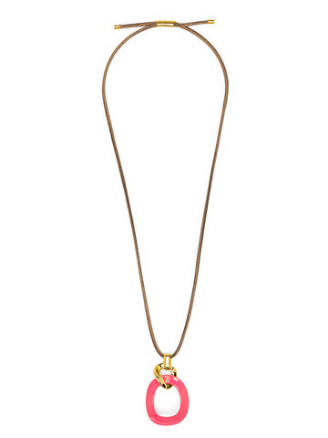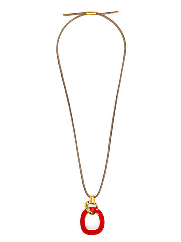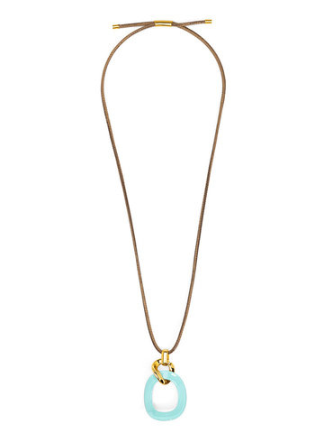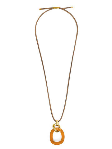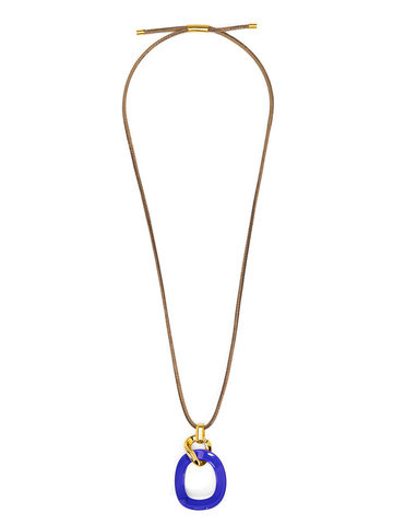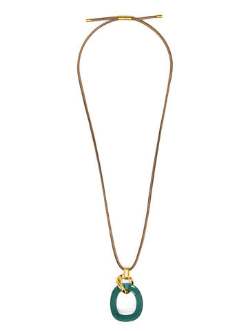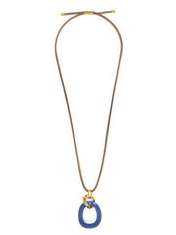 Long necklace featuring a curved oval pendant, accented by gold-toned hardware.
