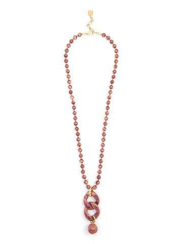 Iridescent beaded long necklace embellished with two curb chain links and a bead charm.