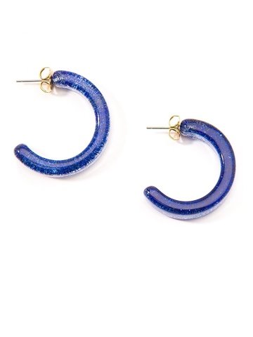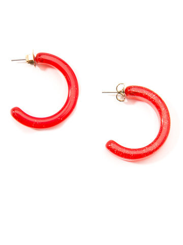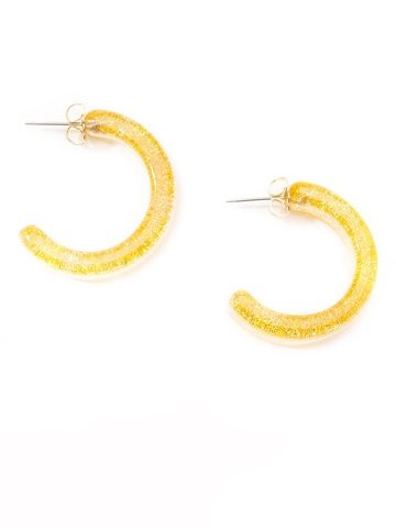 Small, half hoop earring made of resin with colored glitter inside. Lightweight and features gold post back.