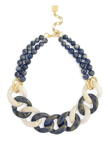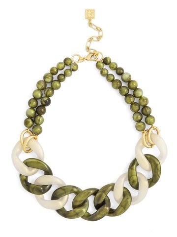 Resin collar necklace designed with iridescent curb chain links and beads and accented with 18K gold-plated rolo links.