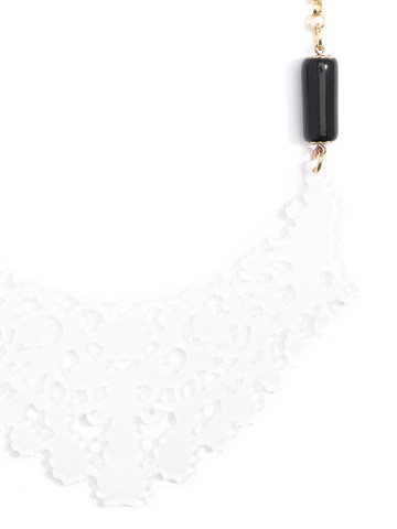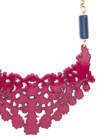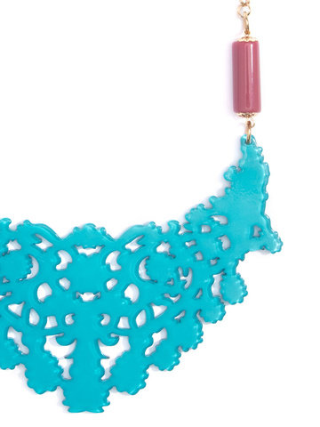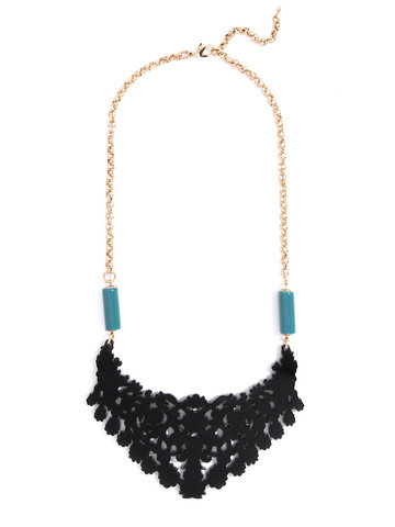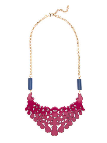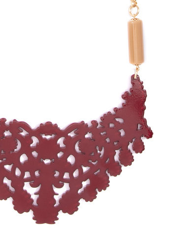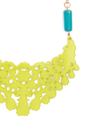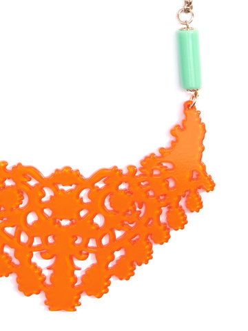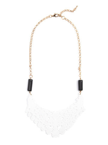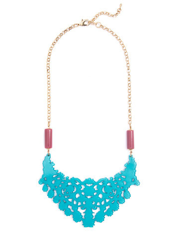 Classic lace takes a twist with this laser cut resin bib necklace in a variety of colors.