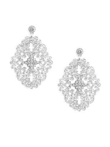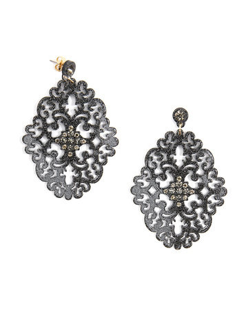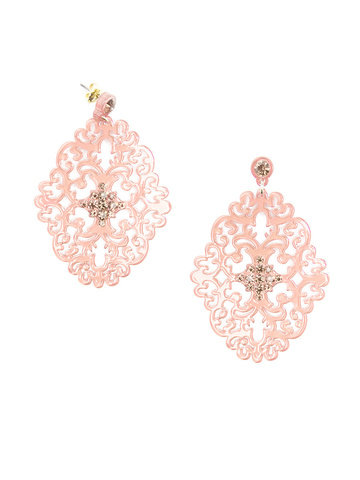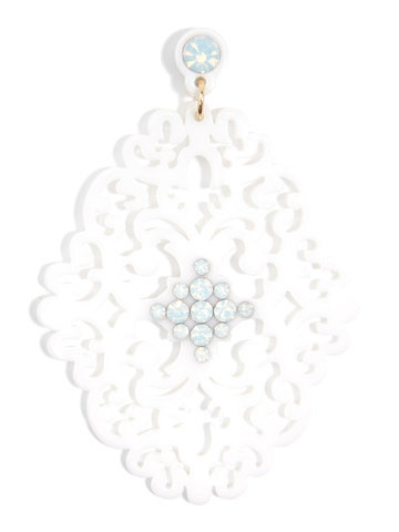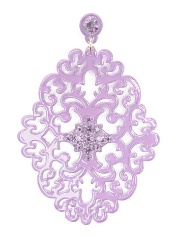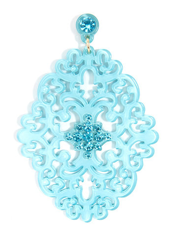 Large statement earring with crystal embellishments on top of brocade patterned, premium-grade resin.