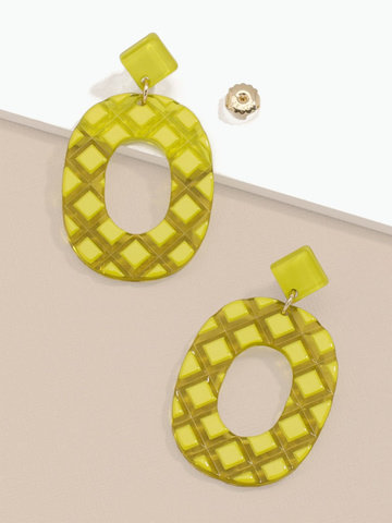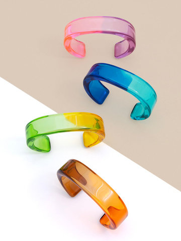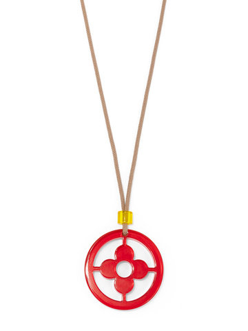 Adjustable long necklace fearring a lucite clover cutout pendant.