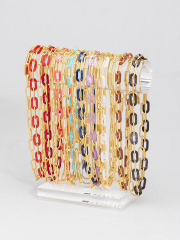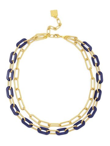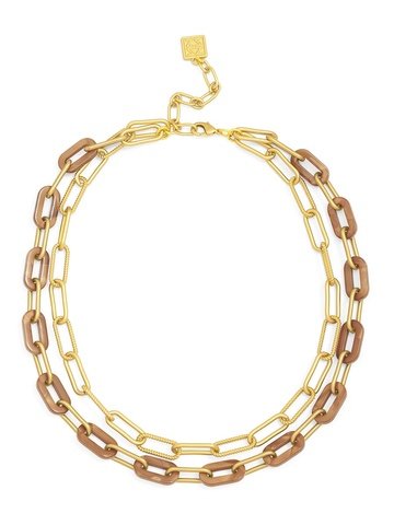 18K gold plated collar necklace designed with layers of metal and marbled resin link links.
