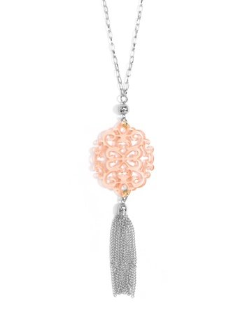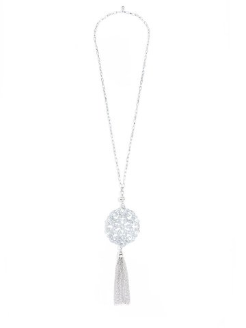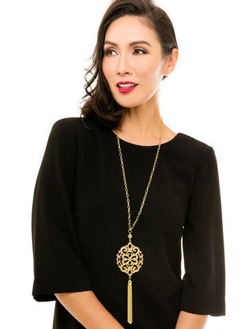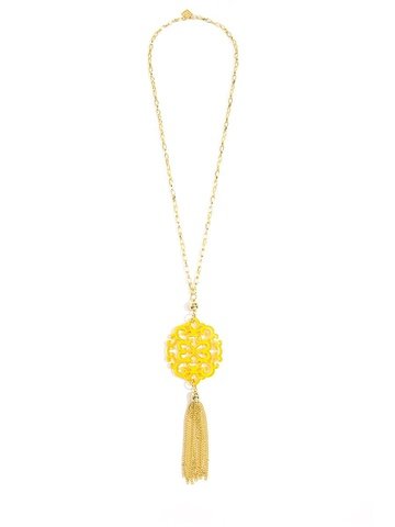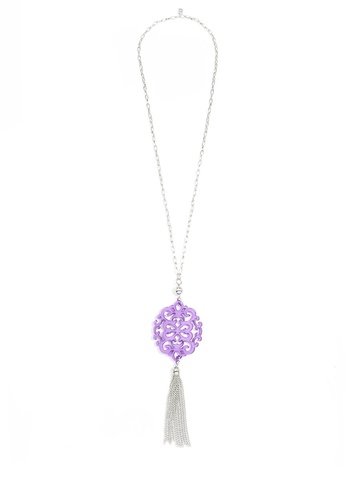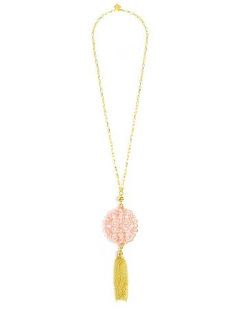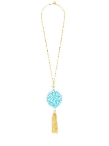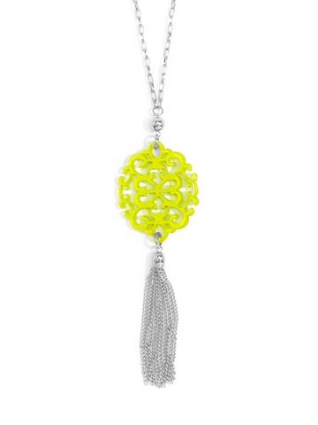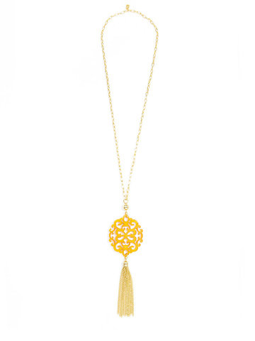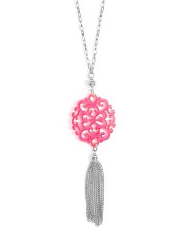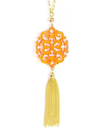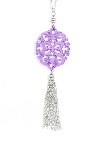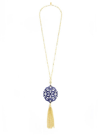 A modern twist on a classic pattern, this damask pendant comes in a variety of colors and is accented with a a chain tassel.