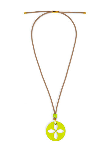 Adjustable long necklace fearring a unique quatrefoil cutout pendant.