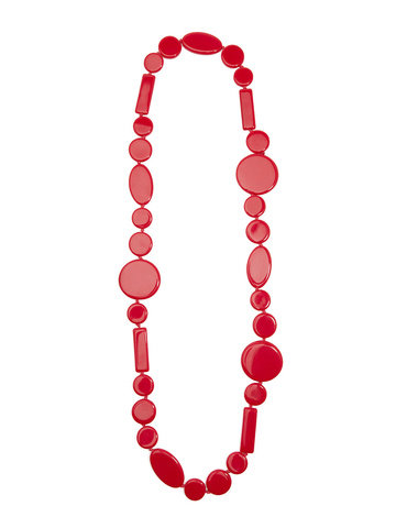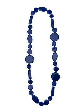 Long, resin necklace with beaded geometric shapes in a glossy finish.