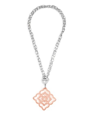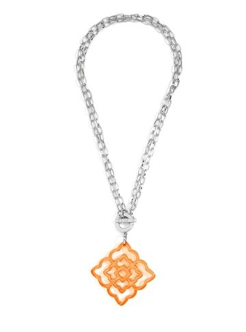 Rose shaped, resin pendant necklace with adjustable length chain.