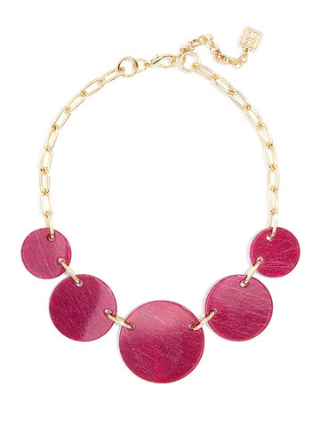 Collar necklace of flat acrylic circles with compressed metallic silk for a static effect.