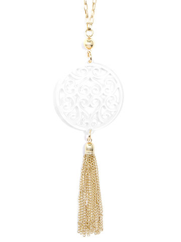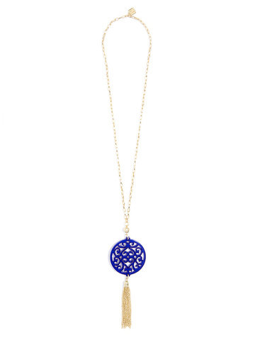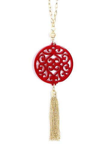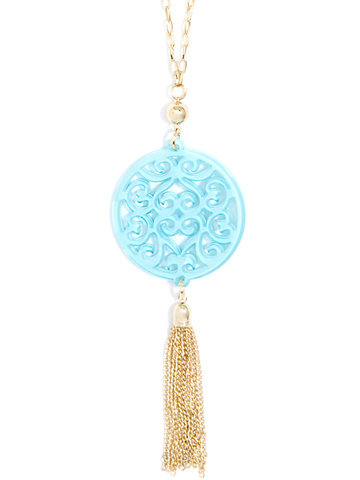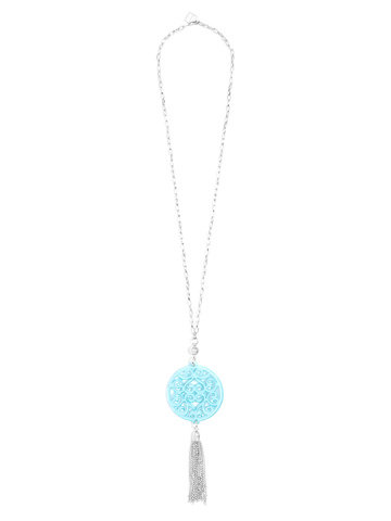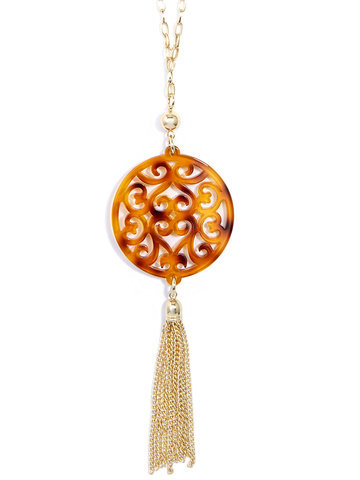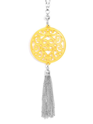 Long, shiny metal chain necklace with a resin pendant in Swirled Circle design and metal tassel drop.