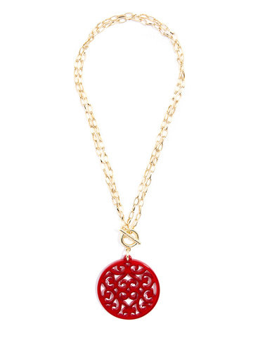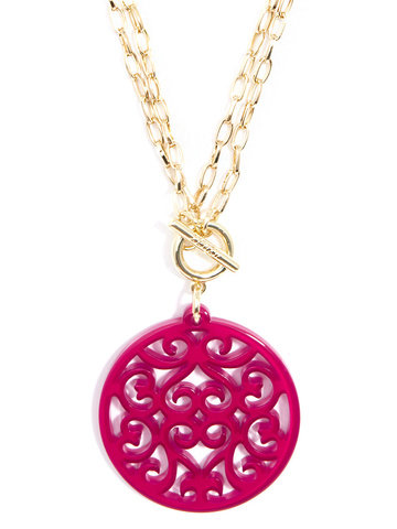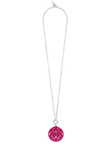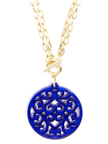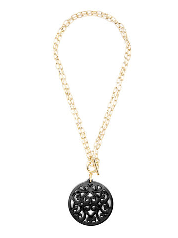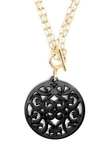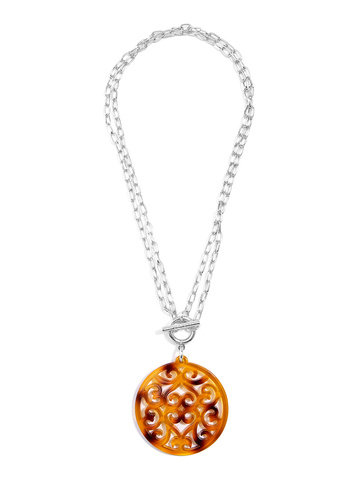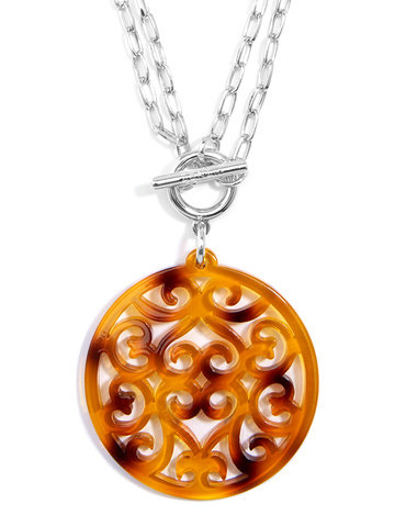 Long, shiny metal chain necklace with a resin pendant in Swirled Circle design. Can be worn as a long necklace or collar necklace.