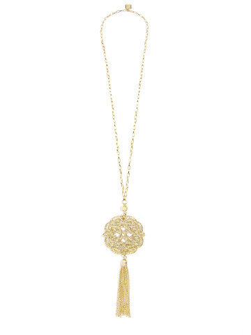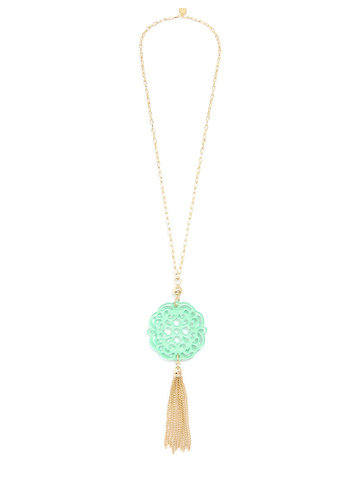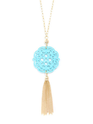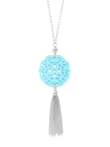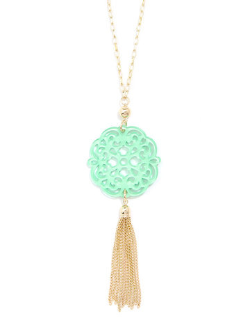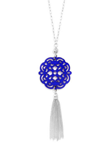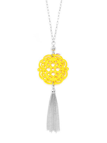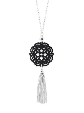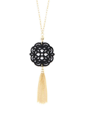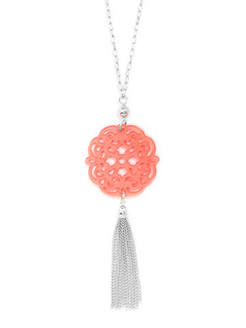 Long, shiny metal necklace with resin pendant in Allure cut-out design and metal tassel