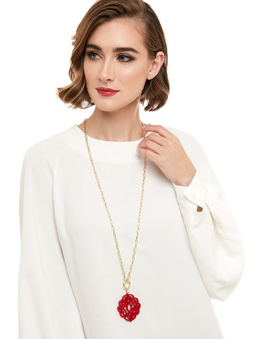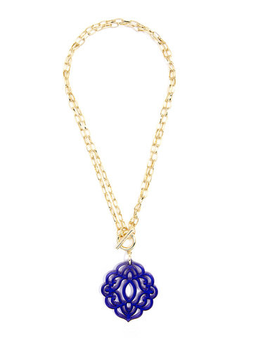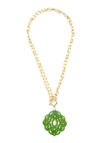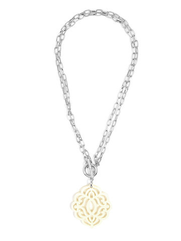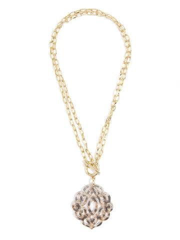 Long, shiny metal chain necklace with baroque-style resin pendant.