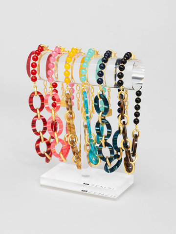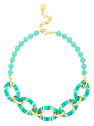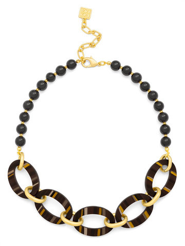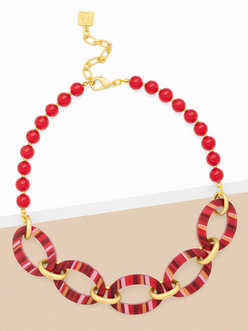 Collar necklace made from glassbeads, featuring striped resin ellipse shapes with metal spacers.