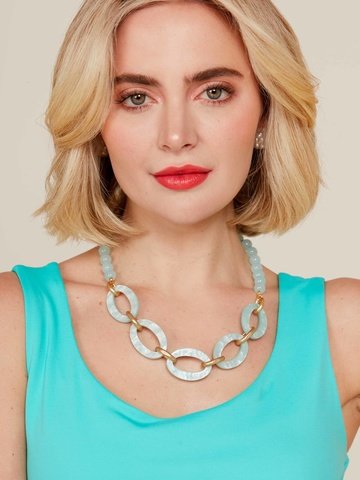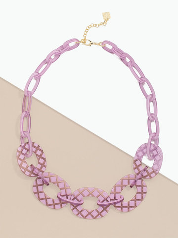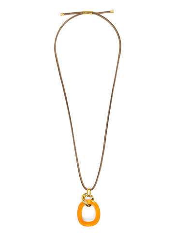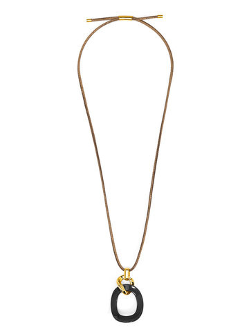 Long necklace featuring a curved oval pendant, accented by gold-toned hardware.