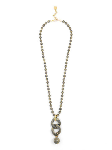Iridescent beaded long necklace embellished with two curb chain links and a bead charm.