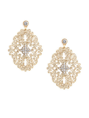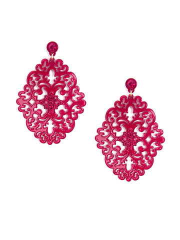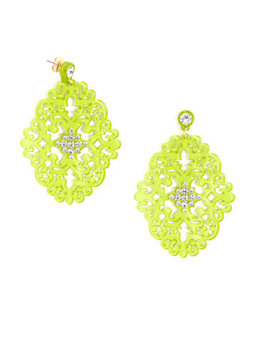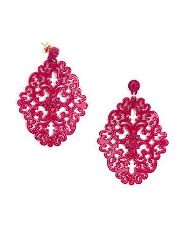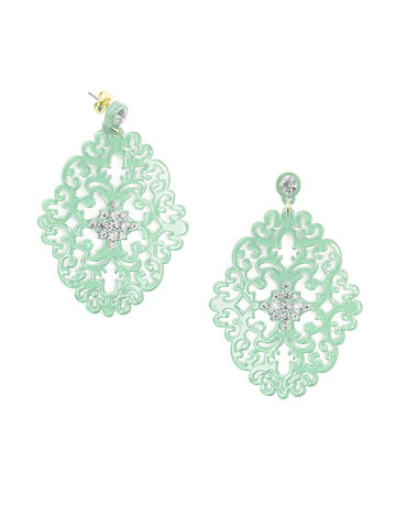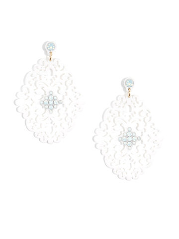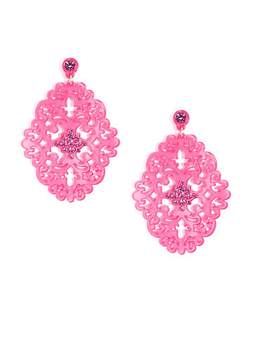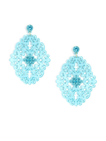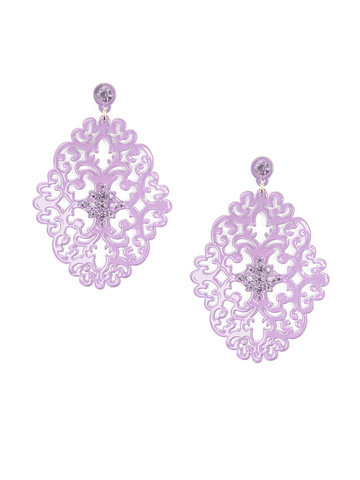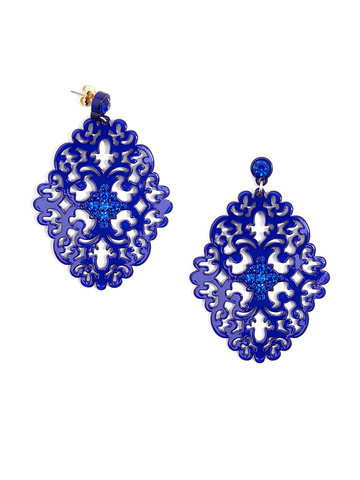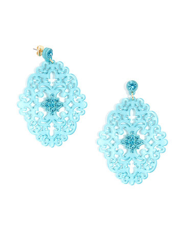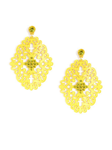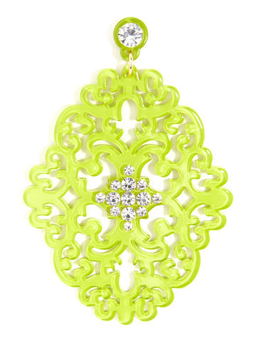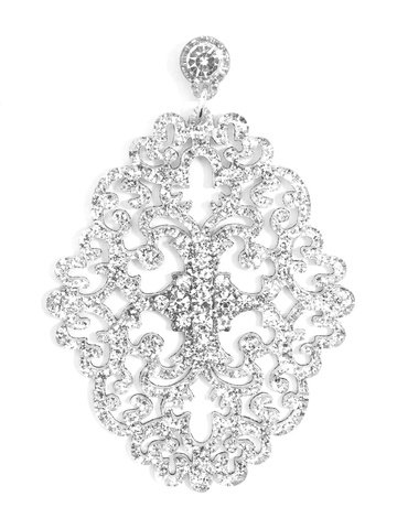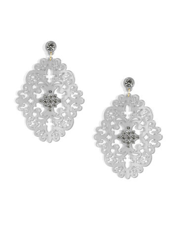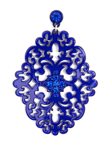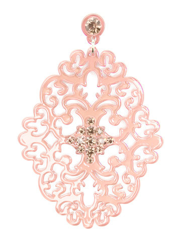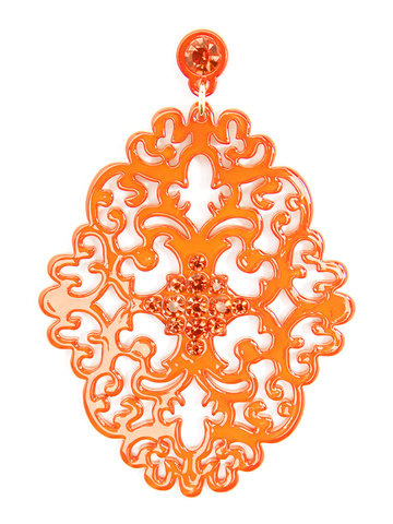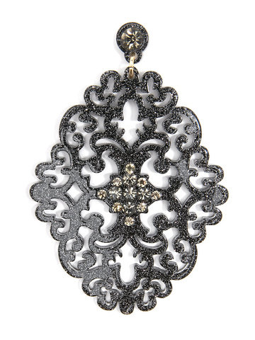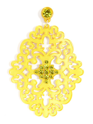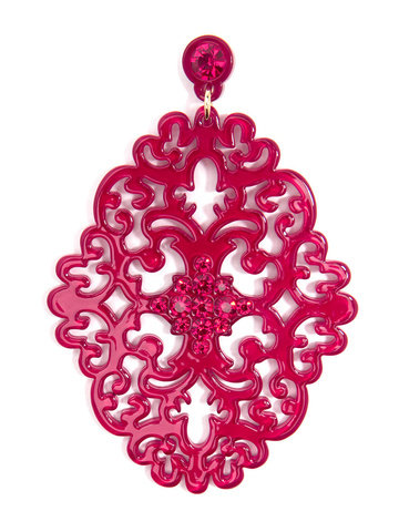 Large statement earring with crystal embellishments on top of brocade patterned, premium-grade resin.