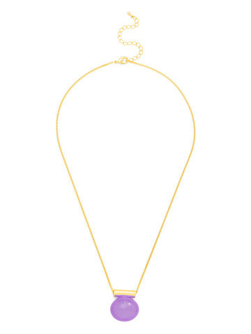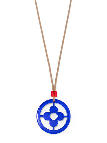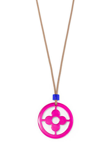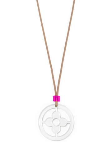 Adjustable long necklace fearring a lucite clover cutout pendant.