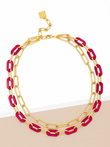 18K gold plated collar necklace designed with layers of metal and marbled resin link links.