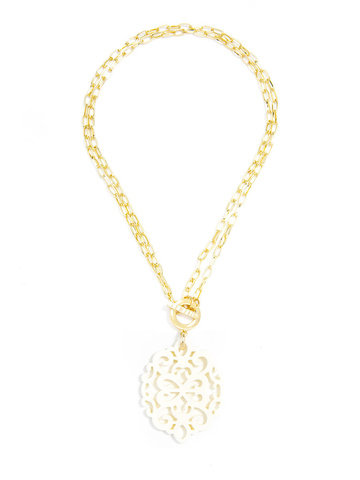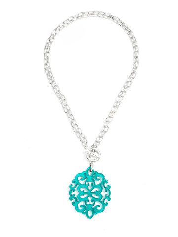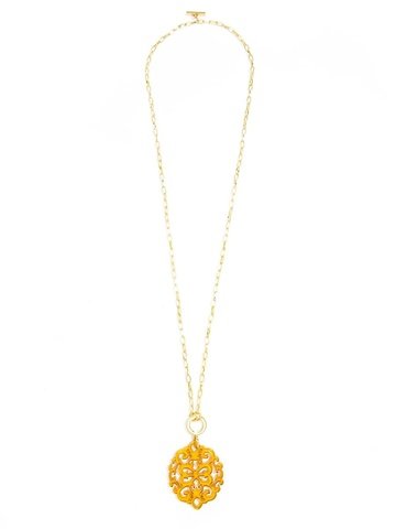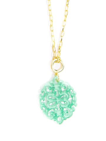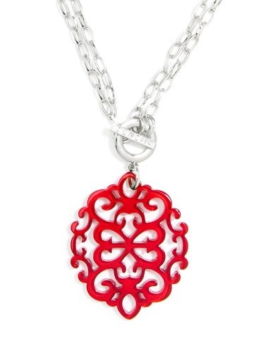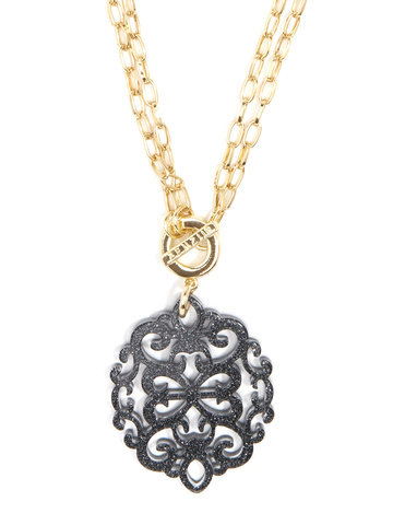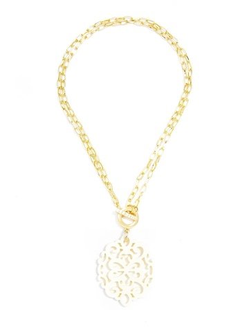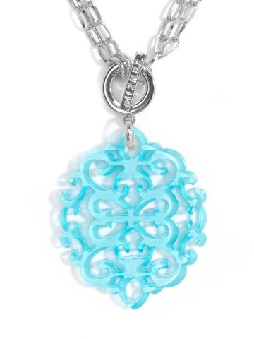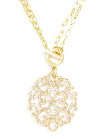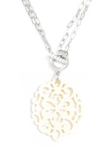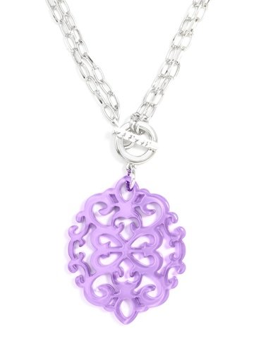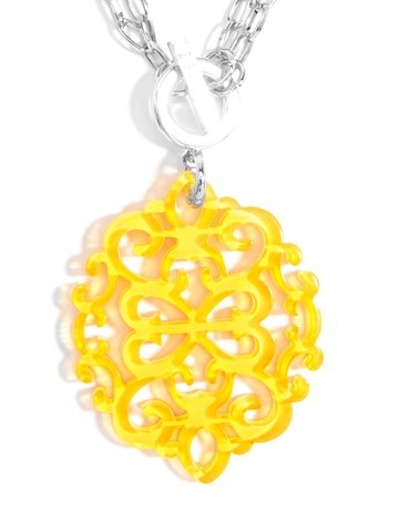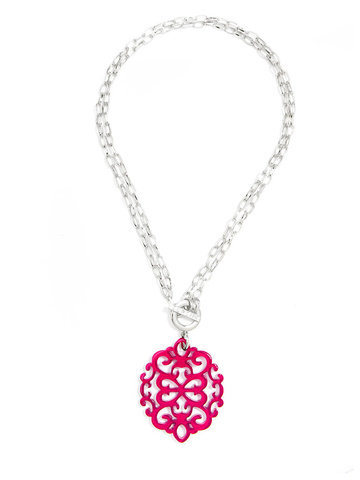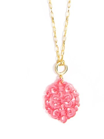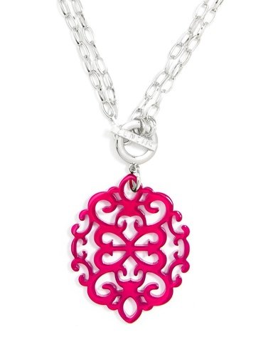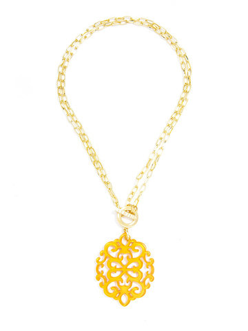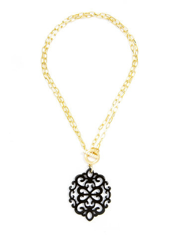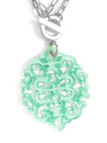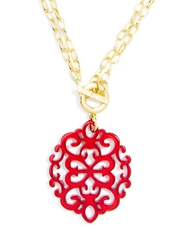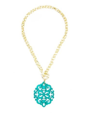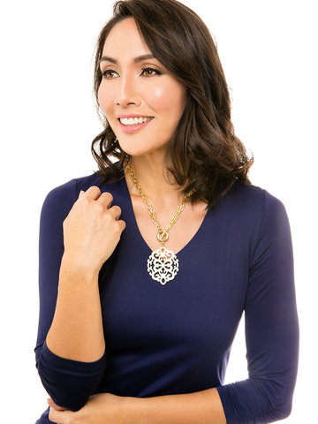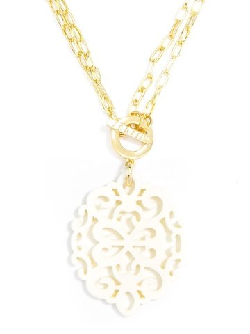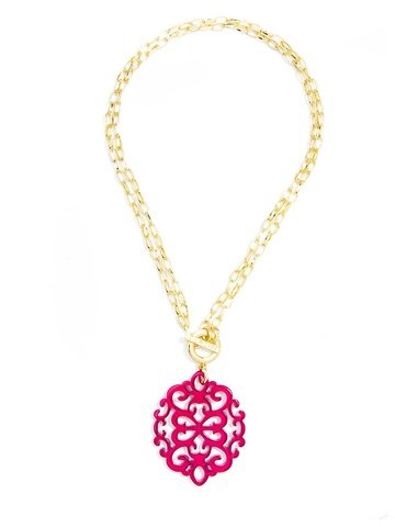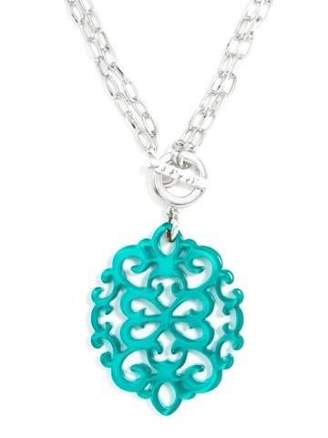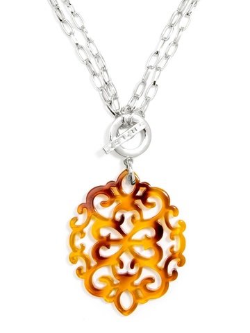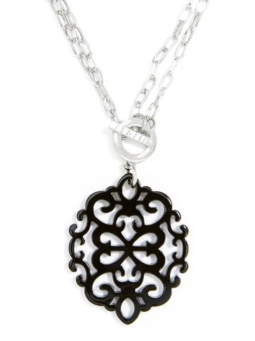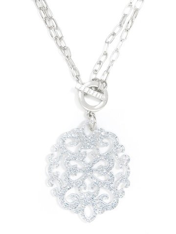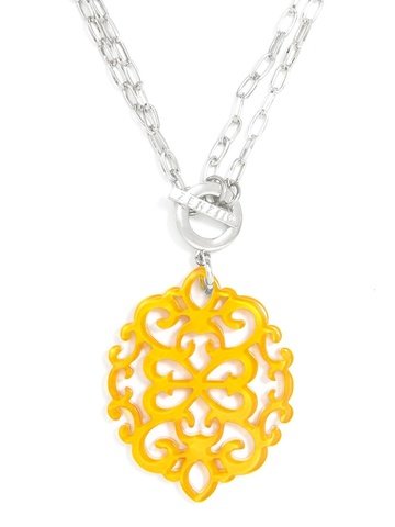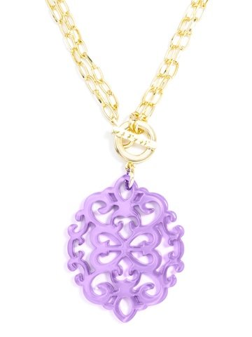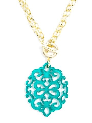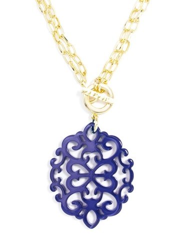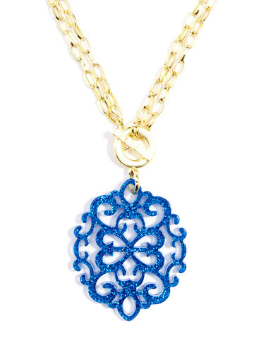 A modern twist on a classic pattern, this damask pendant necklace comes in a variety of colors and has a toggle clasp so you can wear it long or short!