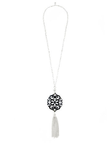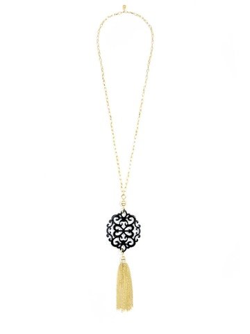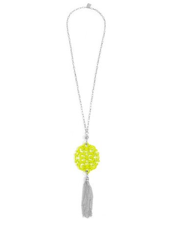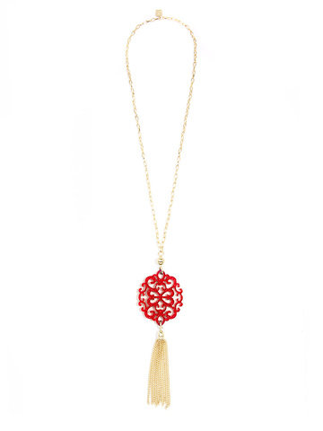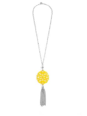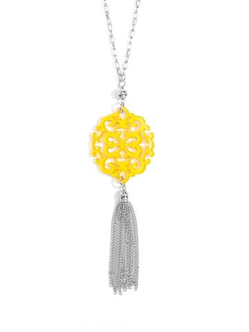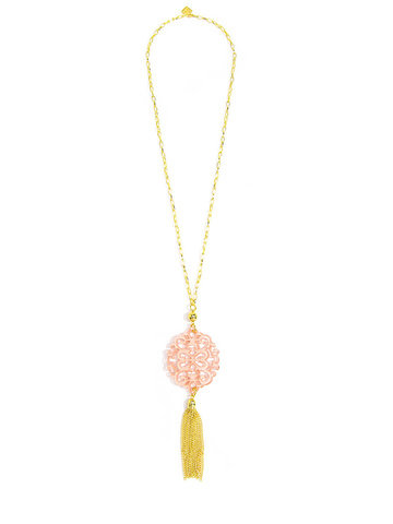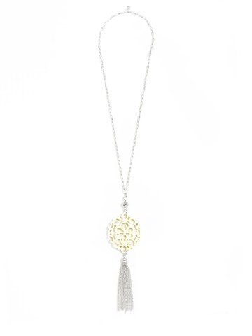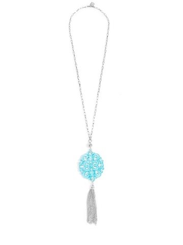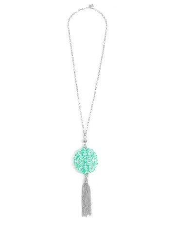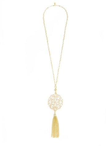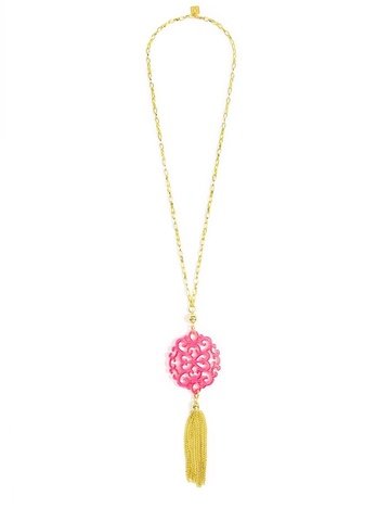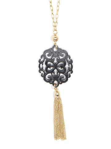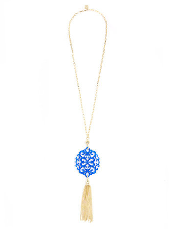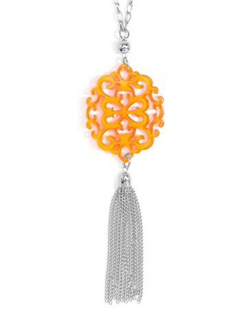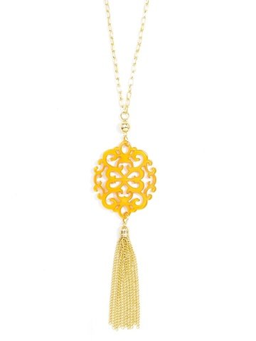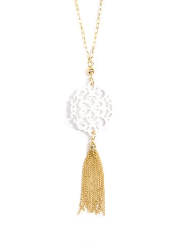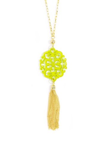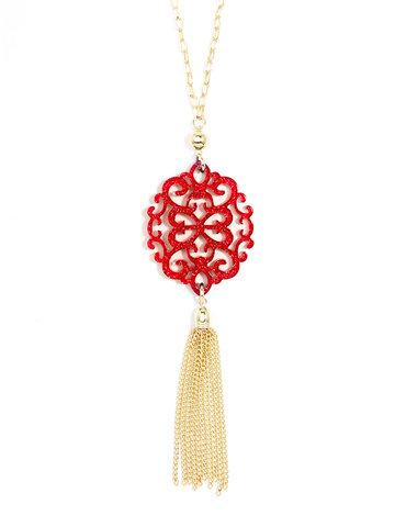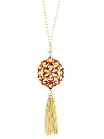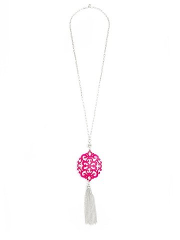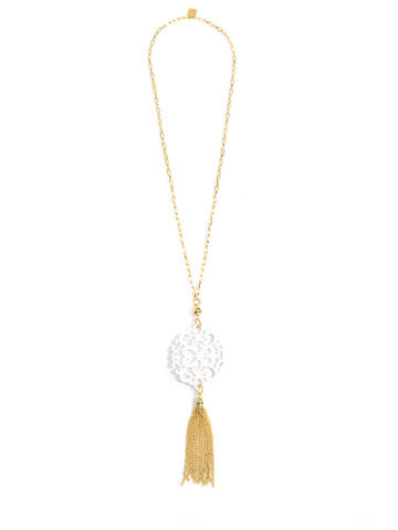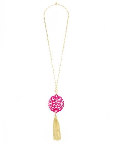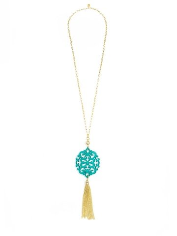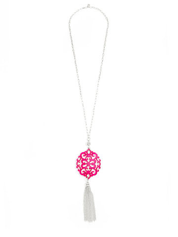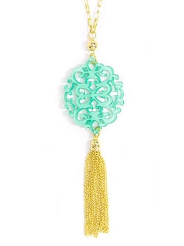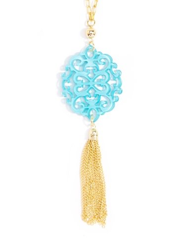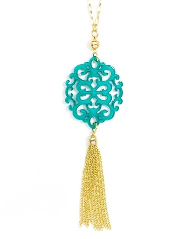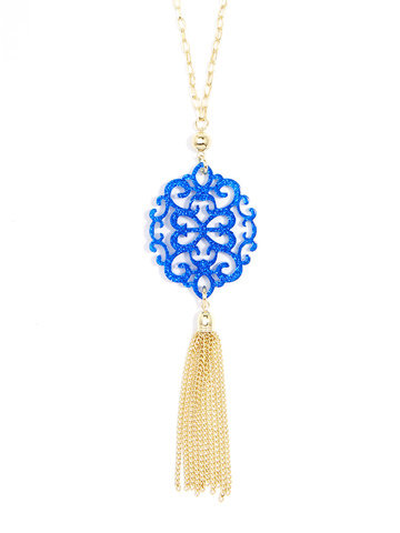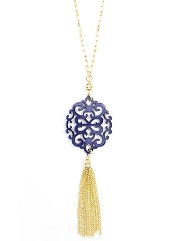 A modern twist on a classic pattern, this damask pendant comes in a variety of colors and is accented with a a chain tassel.
