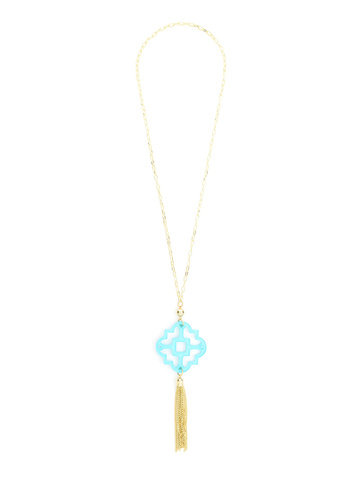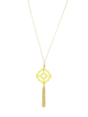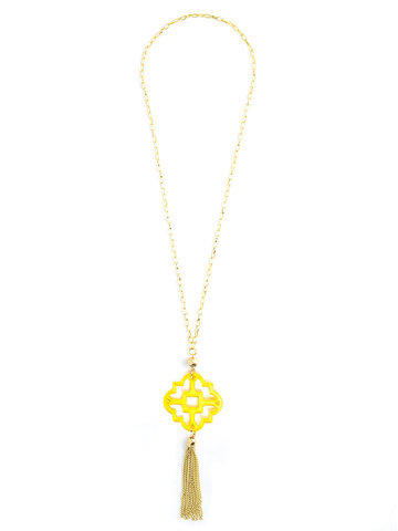 This resin necklace features a lightweight mosaic tile design with a fun fringe tassel.