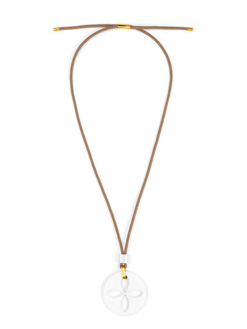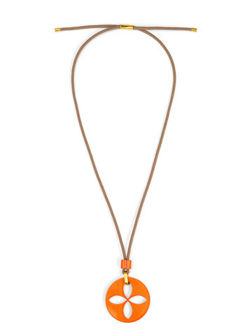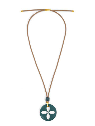 Adjustable long necklace fearring a unique quatrefoil cutout pendant.