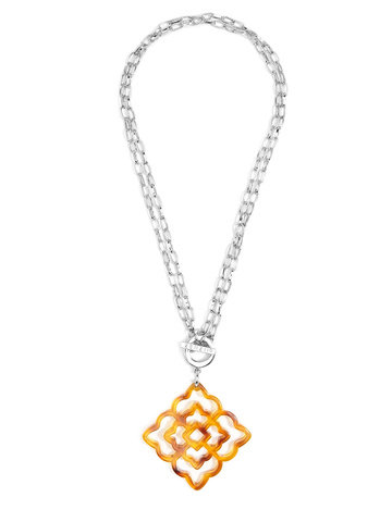 Rose shaped, resin pendant necklace with adjustable length chain.