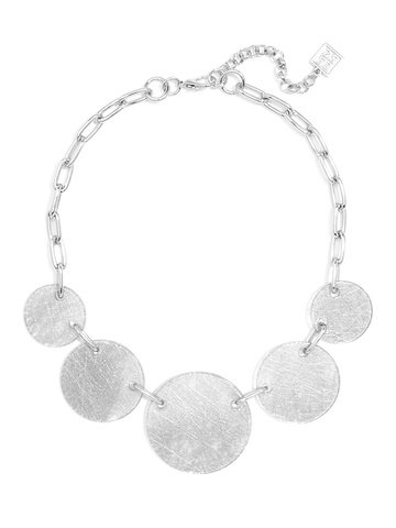 Collar necklace of flat acrylic circles with compressed metallic silk for a static effect.