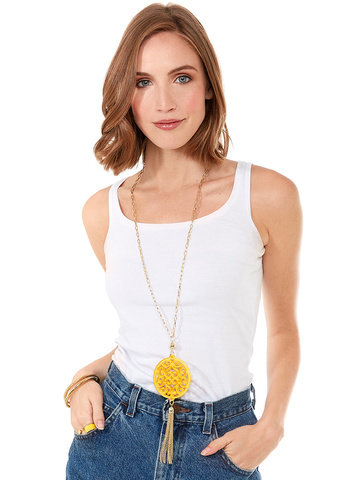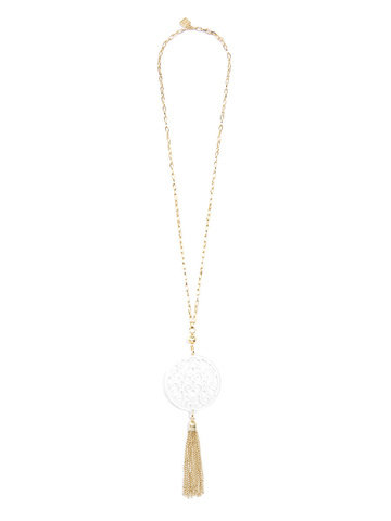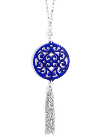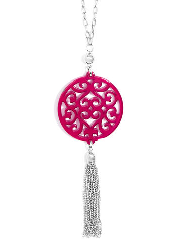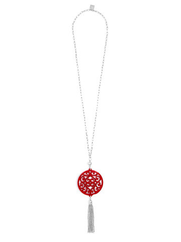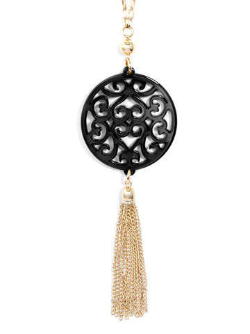 Long, shiny metal chain necklace with a resin pendant in Swirled Circle design and metal tassel drop.