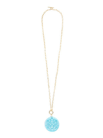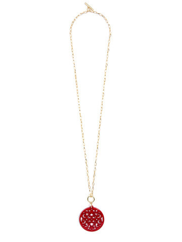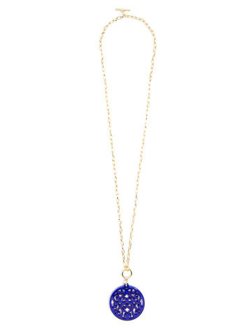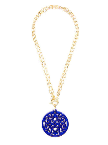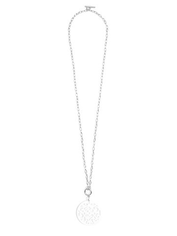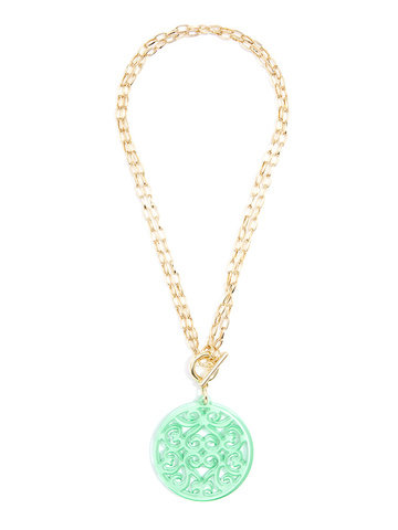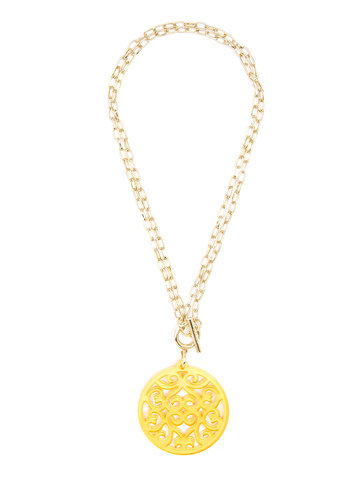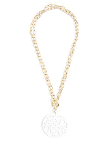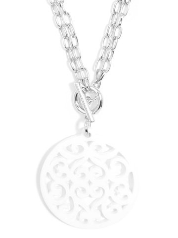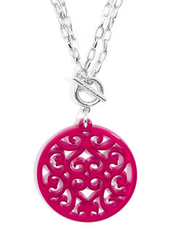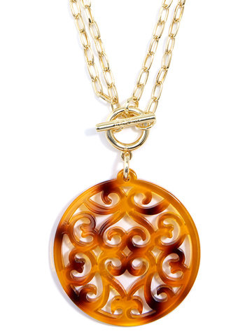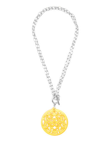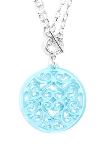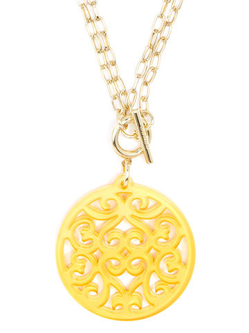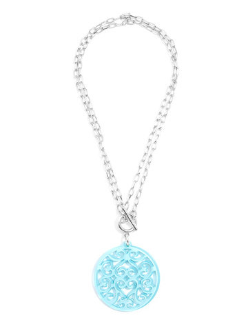 Long, shiny metal chain necklace with a resin pendant in Swirled Circle design. Can be worn as a long necklace or collar necklace.